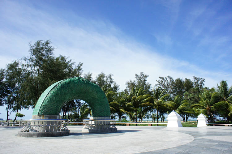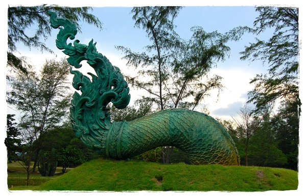 เป็นโครงการที่เทศบาลนครสงขลา สรรค์สร้างขึ้นเพื่อปรับปรุงภูมิทัศน์บริเวณ ชายหาดสมิหลา ให้เป็นสถานที่พักผ่อนของ นักท่องเที่ยวและชาวสงขลา โดยนำเอา คติความเชื่อเกี่ยวกับพญานาคที่เชื่อว่า “พญานาค” เป็นสัญลักษณ์ของการ กำเนิดน้ำและความอุดมสมบูรณ์ ชาวใต้จึงนับถือพญานาคเป็น สิ่งศักดิ์สิทธิ์และกราบไหว้ขอพร เพื่อเป็นสิริมงคลแก่ชีวิต นับ เป็นแหล่งการเรียนรู้ทาง วัฒนธรรมแห่งใหม่ที่เกิดขึ้นของ ชาวสงขลา ประติมากรรมพญานาค พ่นน้ำเป็นสัญลักษณ์หนึ่งของจังหวัดสงขลา มีลักษณะแบบลอยตัว สามารถมองเห็นได้รอบด้าน เนื้อวัตถุ เป็นโลหะทองเหลืองรมสนิมเขียวออกแบบ โดย อาจารย์มนตรี สังข์มุสิกานนท์ (รองอธิการบดีมหาวิทยาลัยทักษิณคนปัจจุบัน) มีการสร้างขึ้นเป็น 3 ส่วน คือ ส่วนที่หนึ่ง หัวพญานาค ตั้งอยู่บริเวณสวนสองทะเล ปลายแหลมสนอ่อน มีขนาดเส้นผ่าศูนย์กลางของลำตัว 1.20 เมตร ความสูงจากฐานลำตัวจนถึงปลายยอดสุดประมาณ 9 เมตร พ่นน้ำลงสู่ปากอ่าวทะเลสาบสงขลา ส่วนที่สอง สะดือพญานาค ตั้งอยู่บริเวณลานชมดาวสนามสระบัว แหลมสมิหลา ขนาดเส้นผ่าศูนย์กลางของลำตัว 1.20 เมตร ความยาว 5.00 เมตร ความสูง 2.50 เมตร ลักษณะลำตัวโค้งครึ่งวงกลม เพื่อให้นักท่องเที่ยวได้ลอด ใต้สะดือพญานาคให้เกิดความเป็นสิริมงคลแก่ตนเอง ส่วนที่สาม หางพญานาค ตั้งอยู่บริเวณชายหาดสมิหลา ริมถนนสะเดา (หลังสนามกอล์ฟ) ขนาดเส้นผ่าศูนย์กลาง 1.20 เมตร ความยาว 4.00 เมตร ความสูง 4.50เมตรปัจจุบันประติมากรรมพญานาคพ่นน้ำได้รับความนิยมจากนักท่องเที่ยวทั้งชาวไทยและชาวต่างประเทศที่เข้ามาเยี่ยมเยือน จังหวัดสงขลา